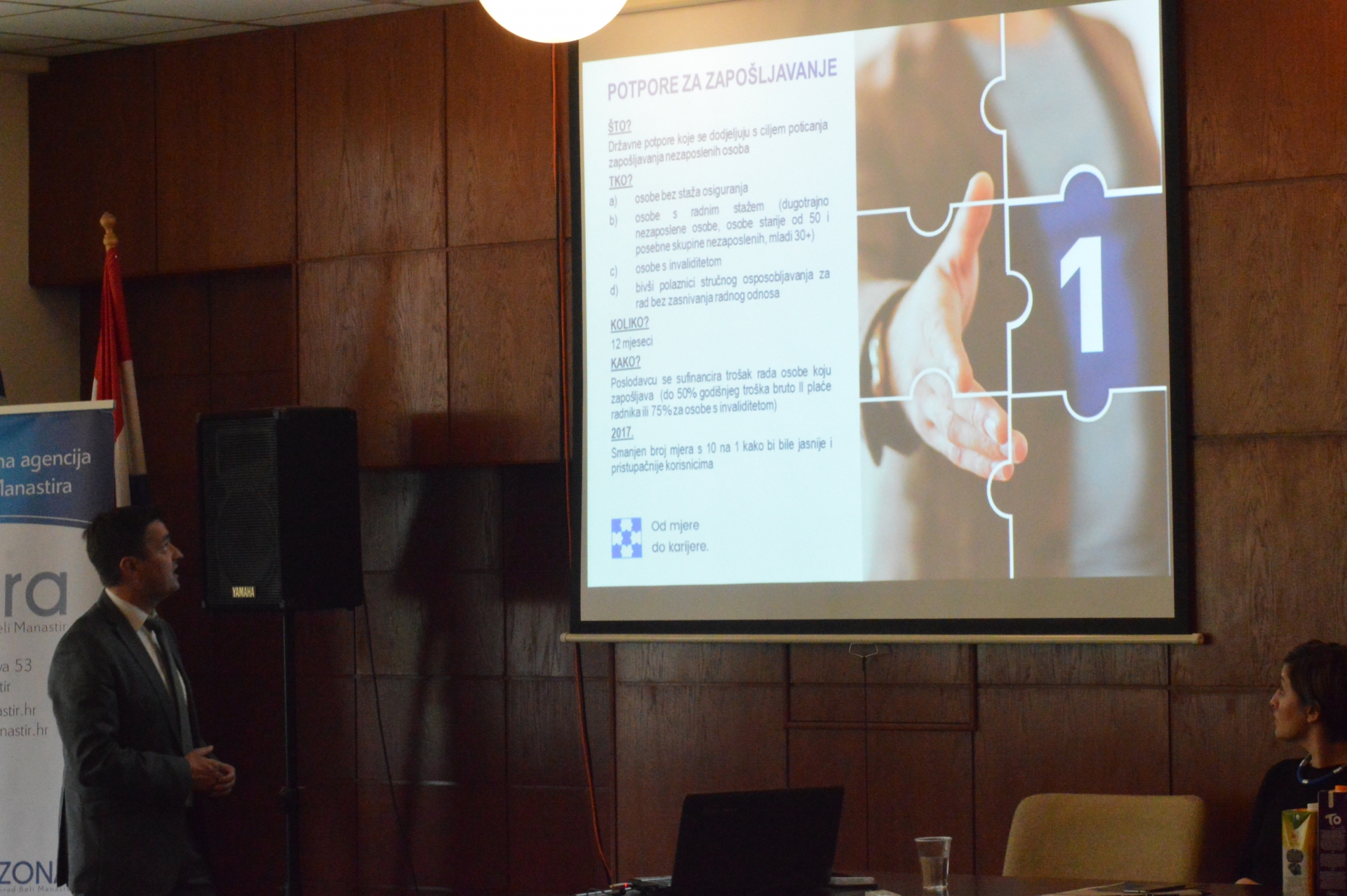 U prvom dijelu predstavljanja g. Miroslav Vanek iz HZZ-a je predstavio mjere aktivne politike zapošljavanja i naveo specifičnosti svake, a gđa Jelena Dajč iz HZZ-a predstavila je novčane iznose za svaku od mjera.